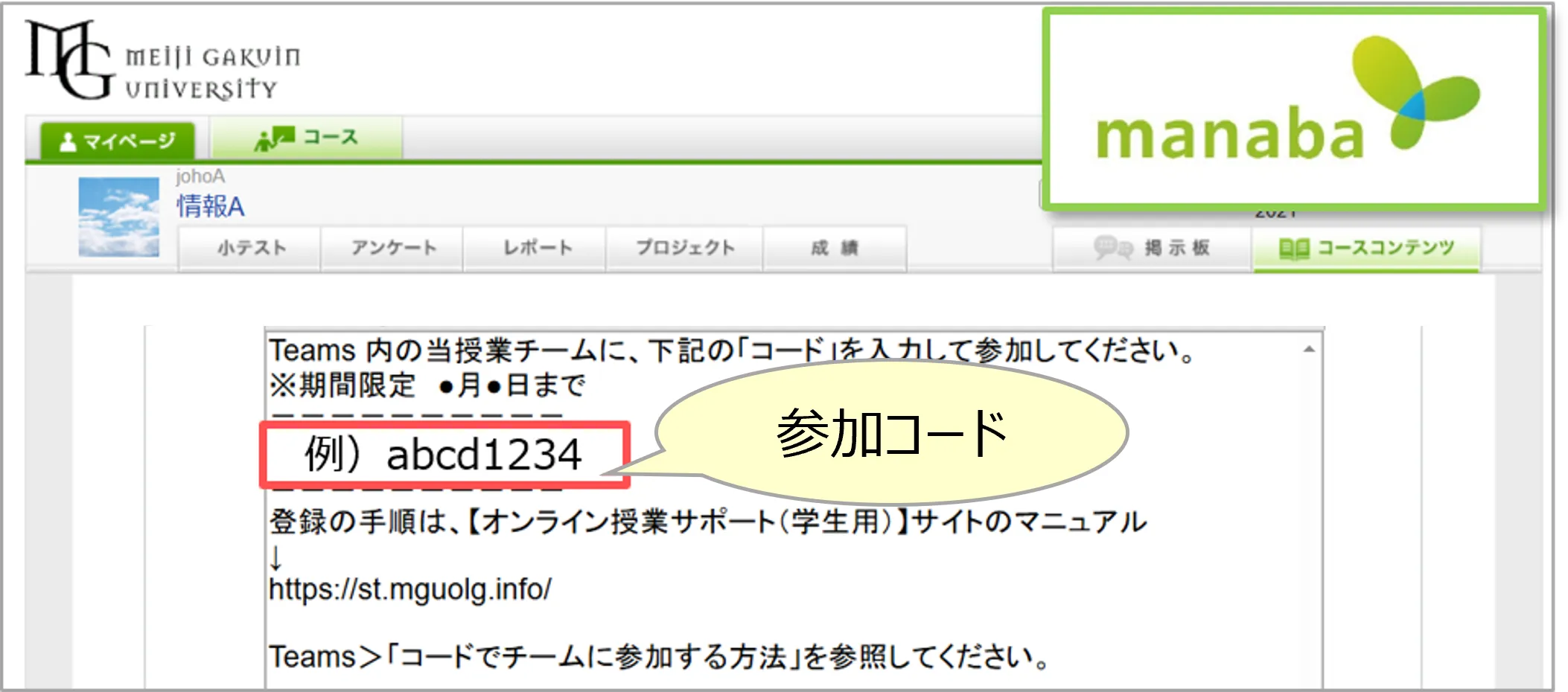 - 学生(履修者)への参加の案内は、通常 manaba に掲載されます。