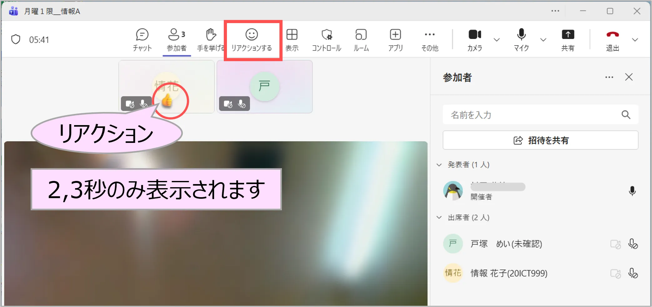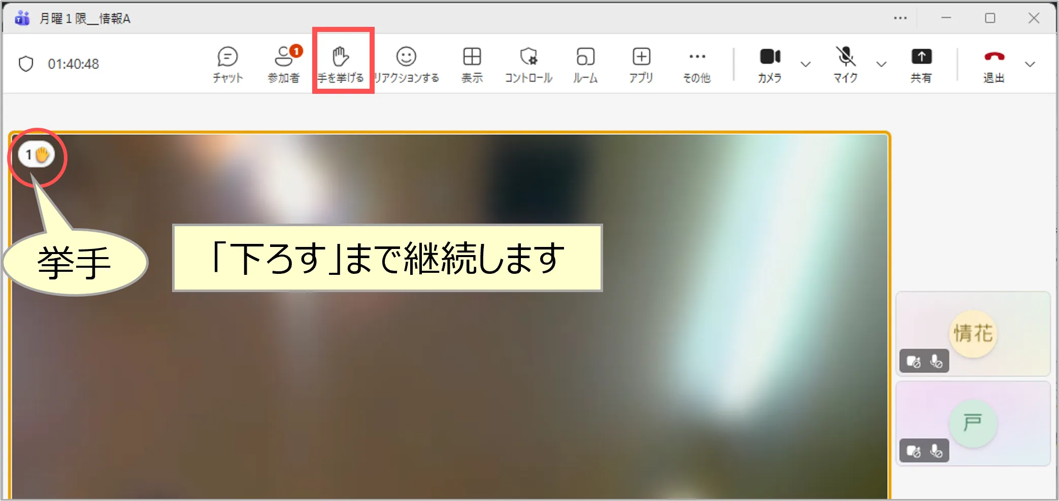 | 手を挙げる | 発言の意思表示。もう一度押すと「手を下ろす」 |
