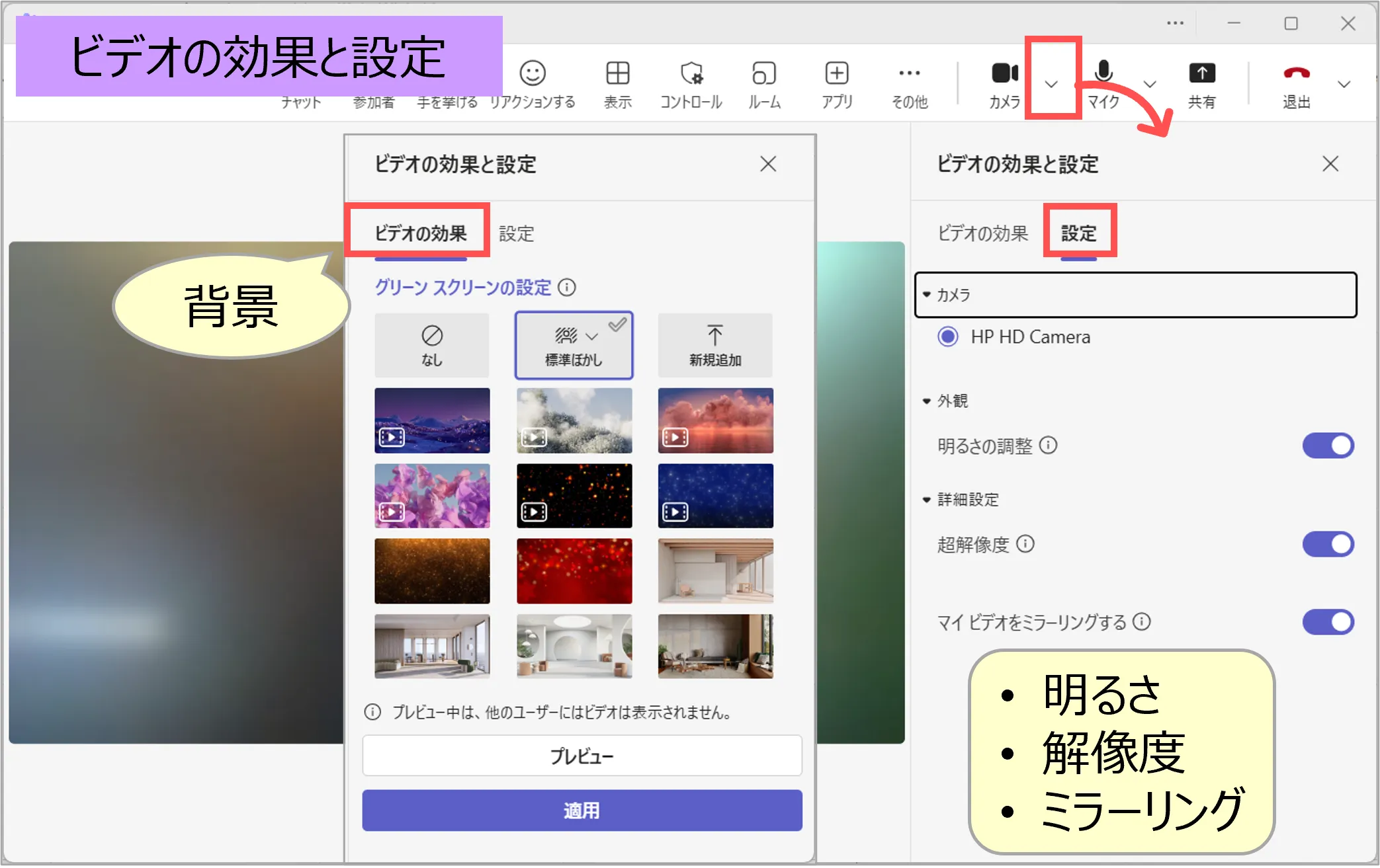 | カメラ | カメラの選択 / ビデオの効果(背景)と設定 |