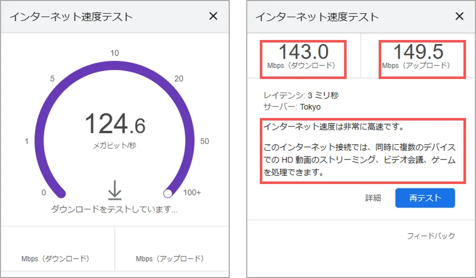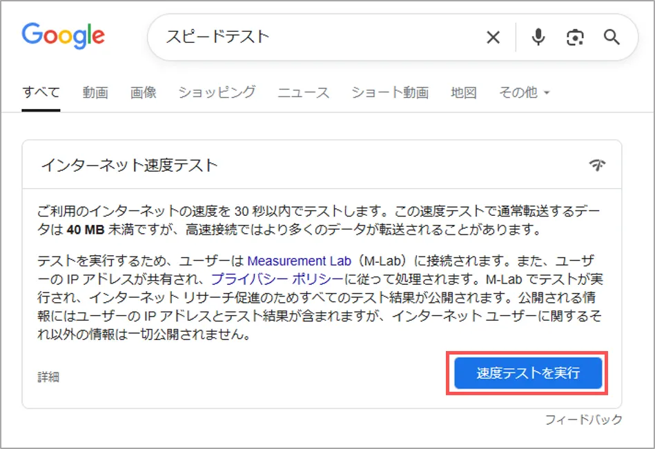 ▶「FAQ (全般)」へ 1.ブラウザで「Google」を開く 「スピードテスト」と入力して検索 「速度テストを実行」をクリック 2.確認 表示された診断を確認してください ▲Topへ 更新:2025/08