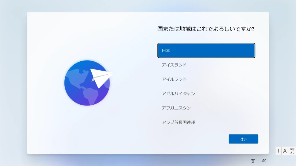 「日本」を選択します。これは時刻設定(タイムゾーン)の同期や、地域固有のシステムサービスを正しく動作させるために必須です。