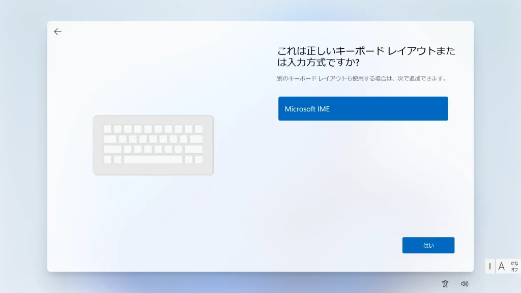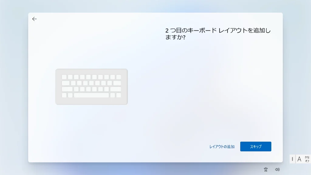 2つ目のレイアウト追加画面では通常は「スキップ」を選択してください。入力環境を最小限に構成することで、不適切な言語切り替えによるトラブルを未然に防ぎます。