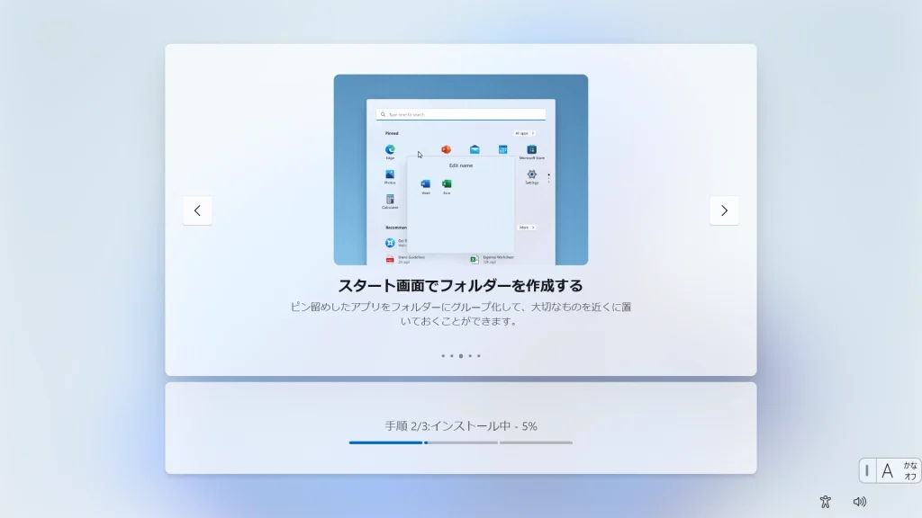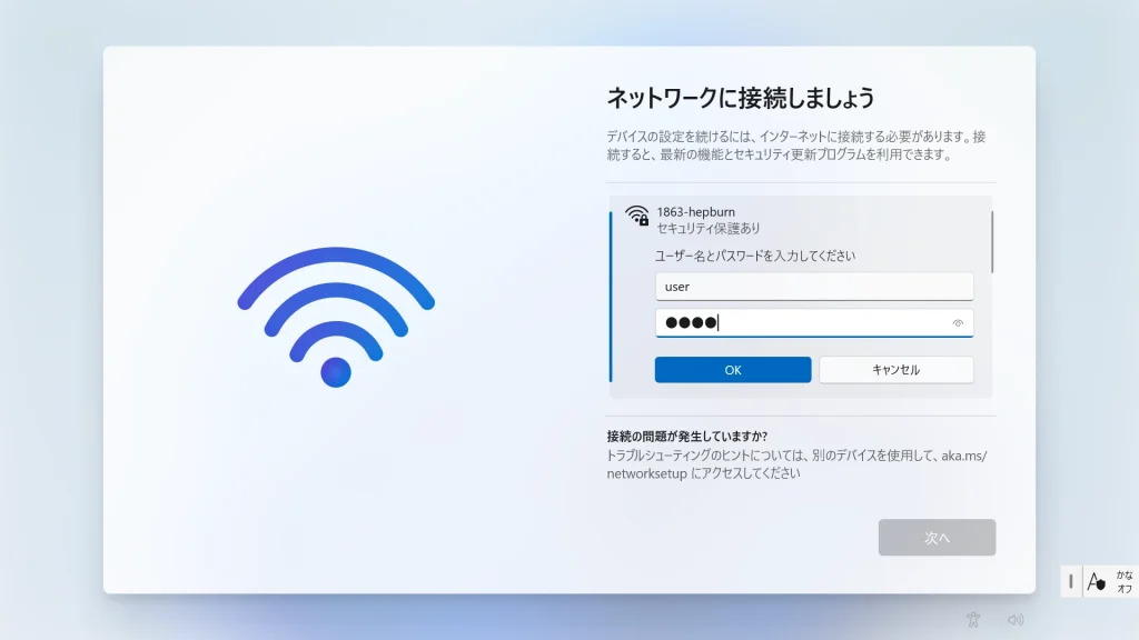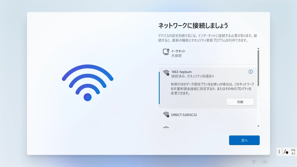 適切なWi-Fiまたは有線LANに接続します。この後のフェーズで最新の更新プログラムを適用するために必要となります。