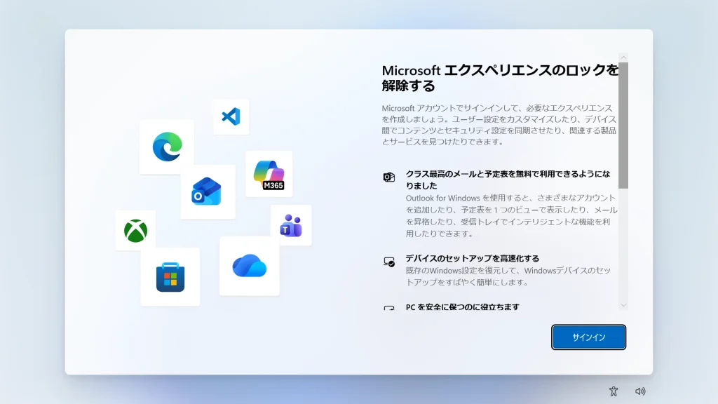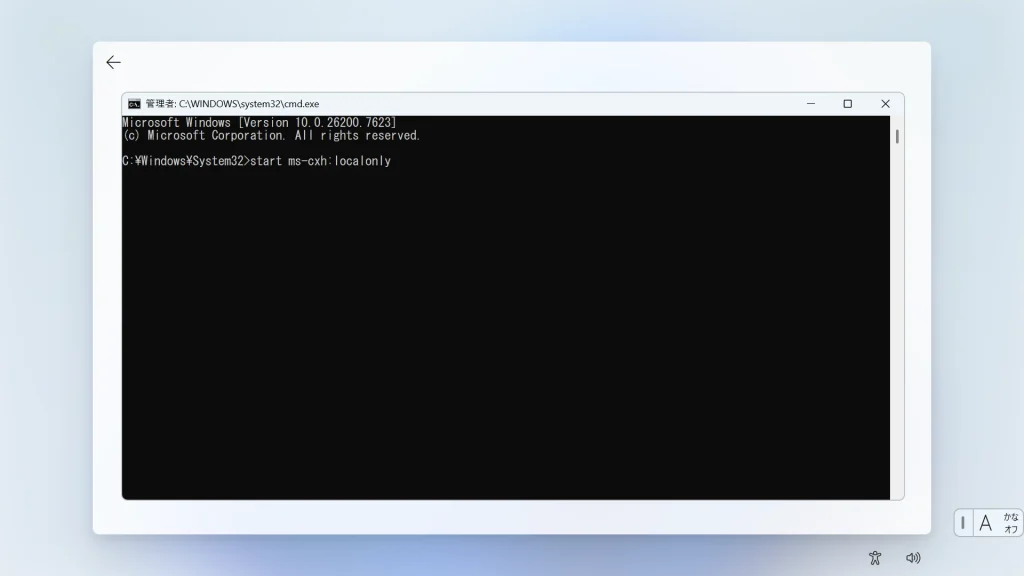 「Microsoft エクスペリエンスのロックを解除する」または「サインイン」画面が表示されたら、メールアドレス等を入力する前に、キーボードの Shift + F10 を押下してコマンドプロンプトを起動します。
