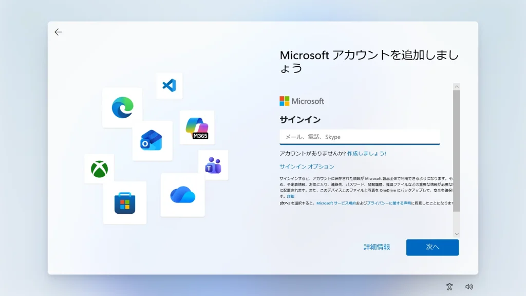 Windows 11 Pro(バージョン 25H2想定)の導入において、Microsoft アカウントを介さず「ローカルアカウント」でセットアップを完結させる手順です。(バージョンが異なる場合は、画面や手順が変更されている場合があります。)