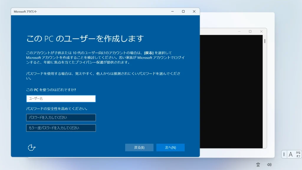 「この PC のユーザーを作成します」という青い画面が表示されます。