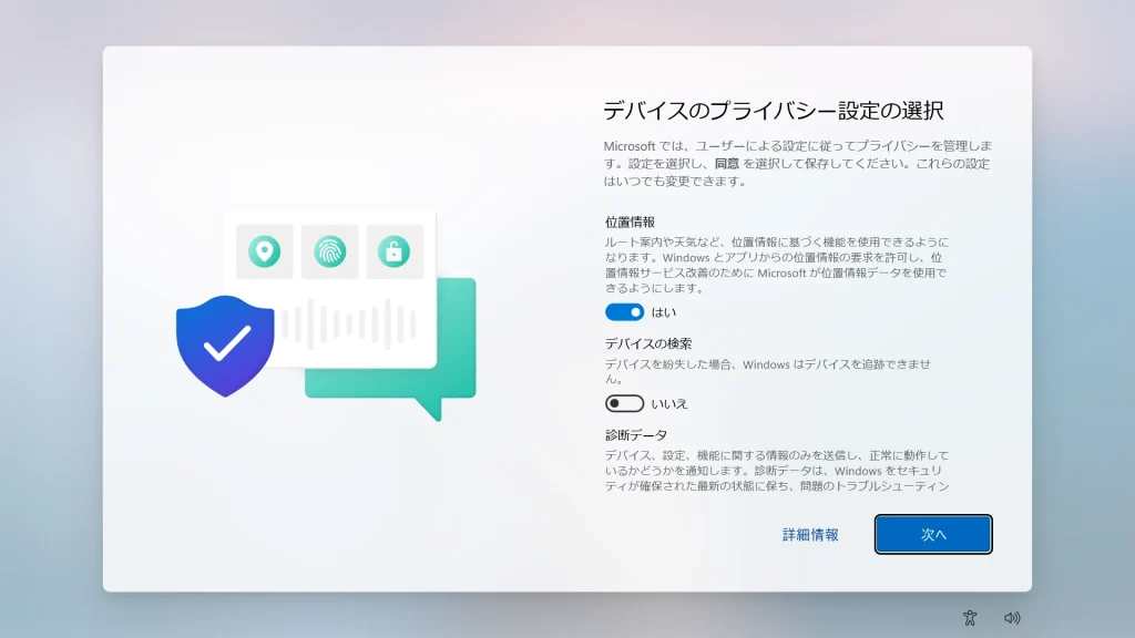 - 診断データ / 広告識別子: 基本的に「いいえ」を選択し、余計な通信を抑制します。