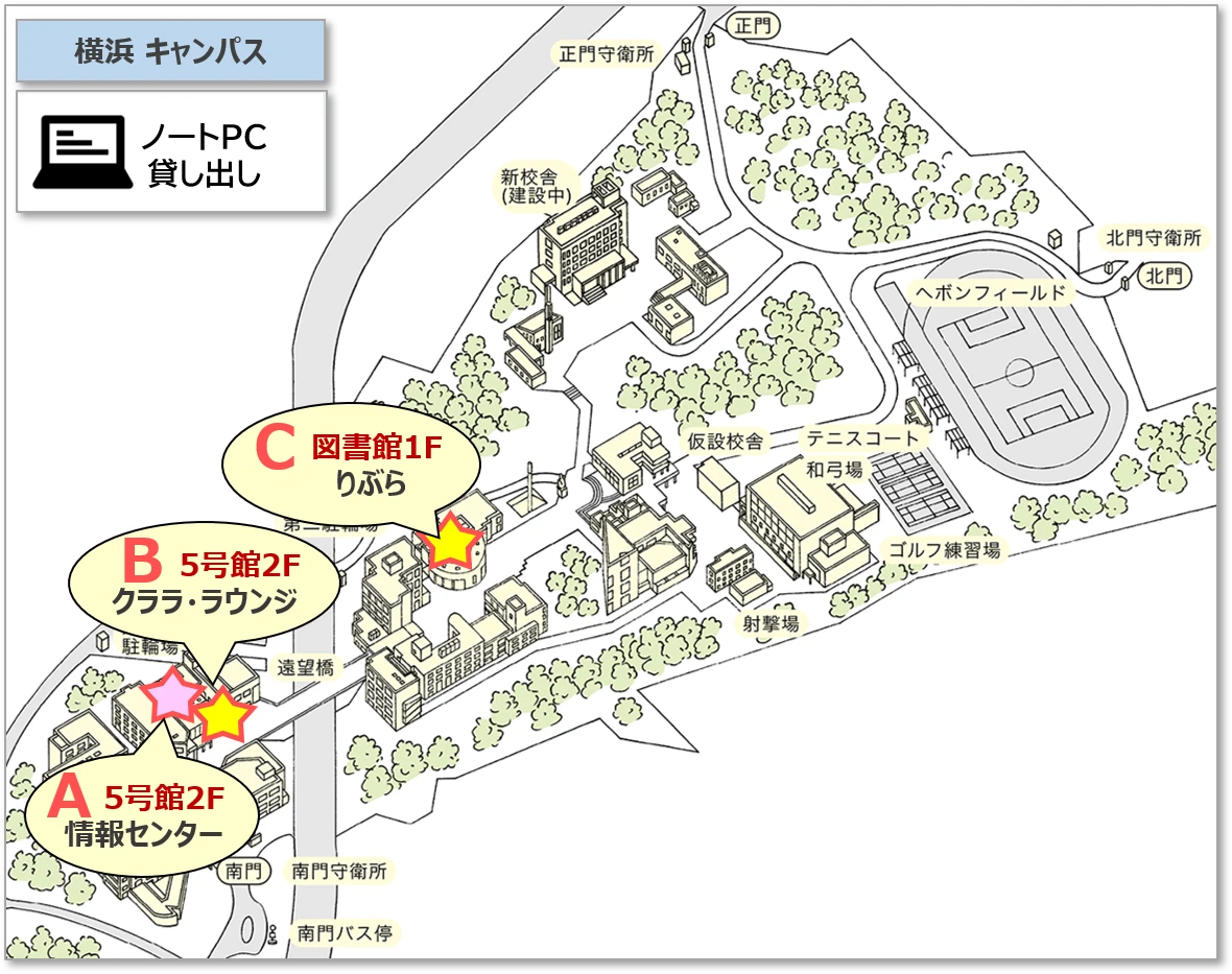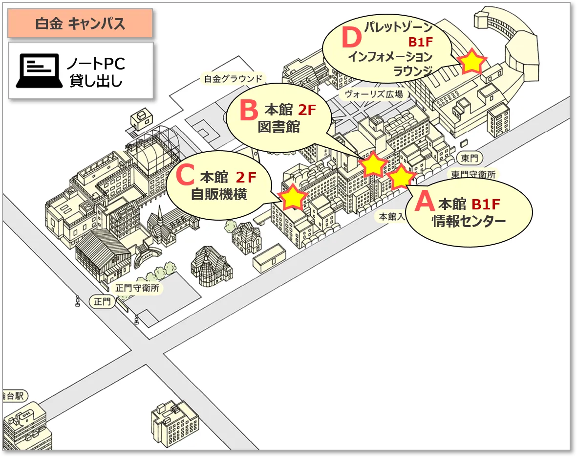 各キャンパスでは、自習のため自由に利用できるノート PC の貸し出しを行っています。