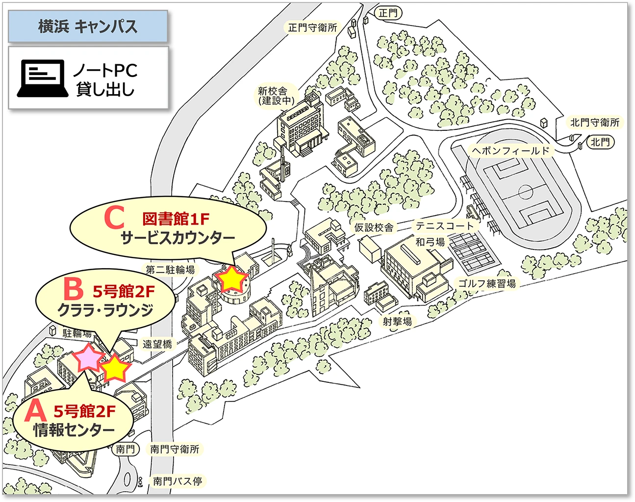 各キャンパスでは、自習のため自由に利用できるノート PC の貸し出しを行っています。