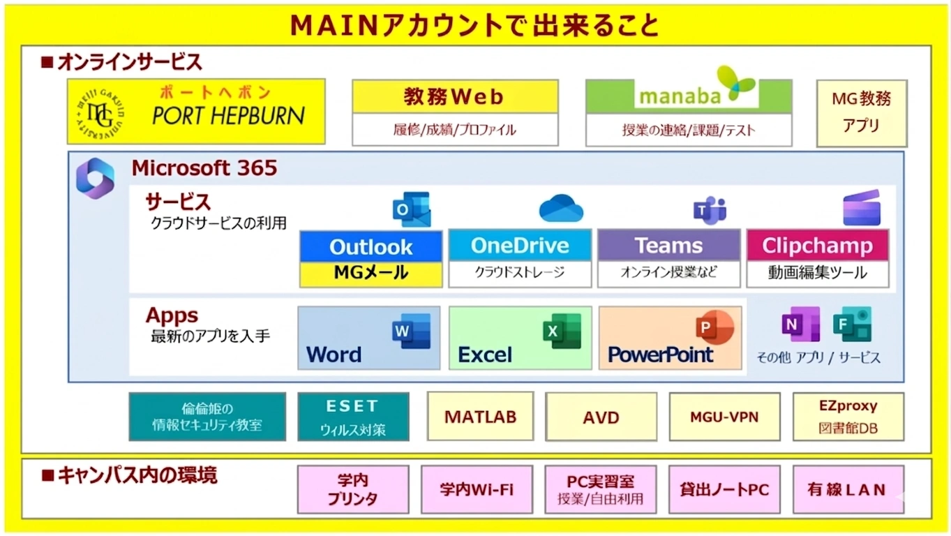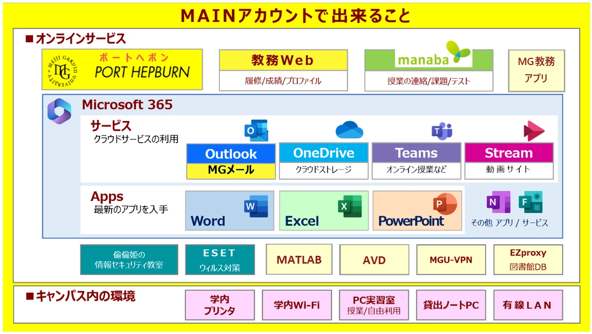※MAIN(メイン:Meijigakuin Academic Information Network)とは、明治学院大学コンピュータネットワークの名称です。