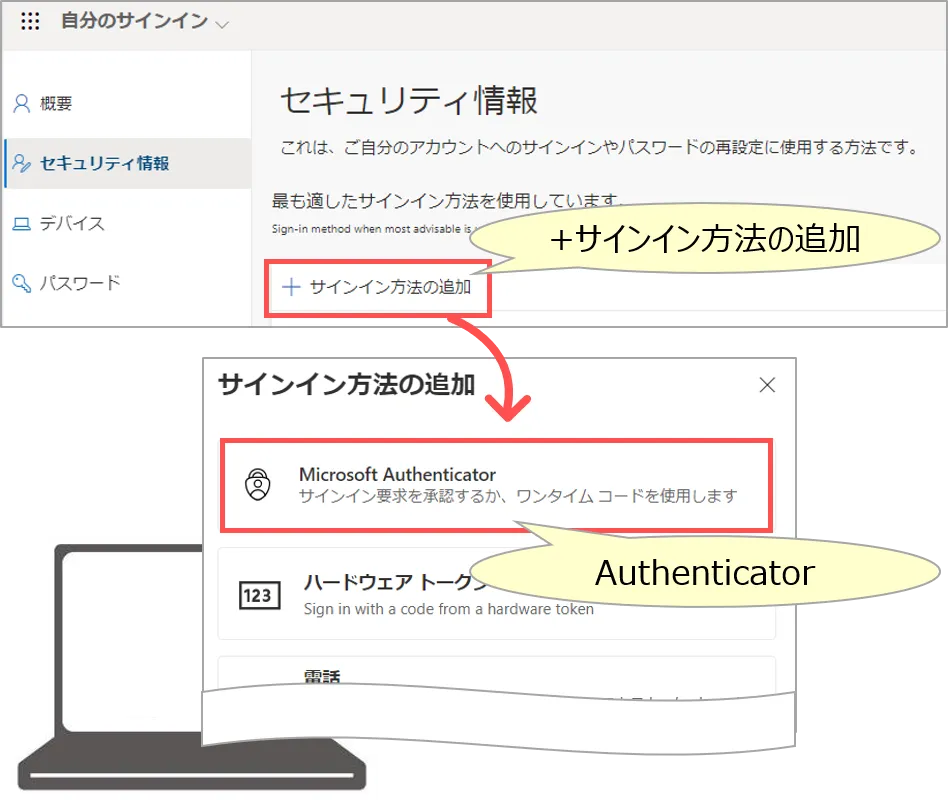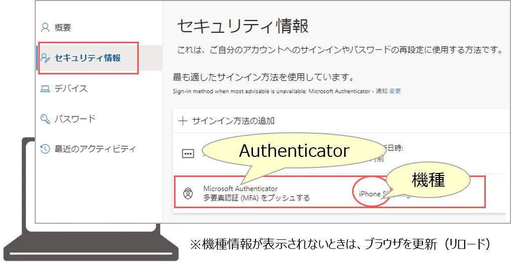 「セキュリティ情報」(https://mysignins.microsoft.com/security-info)にアクセス - 【アプリ認証】を実行します