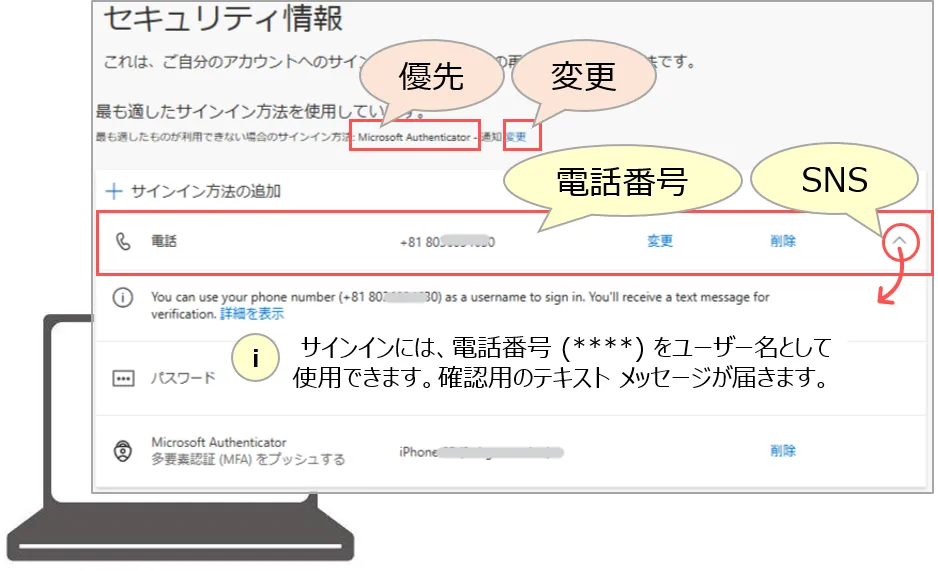 「セキュリティ情報」(https://mysignins.microsoft.com/security-info)にアクセス