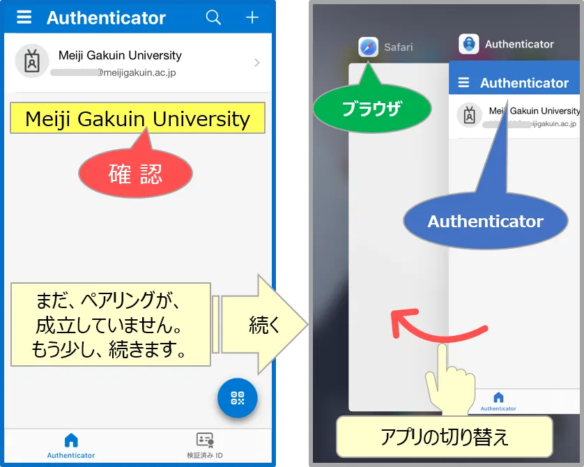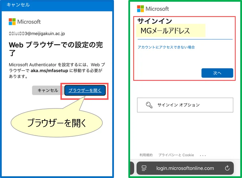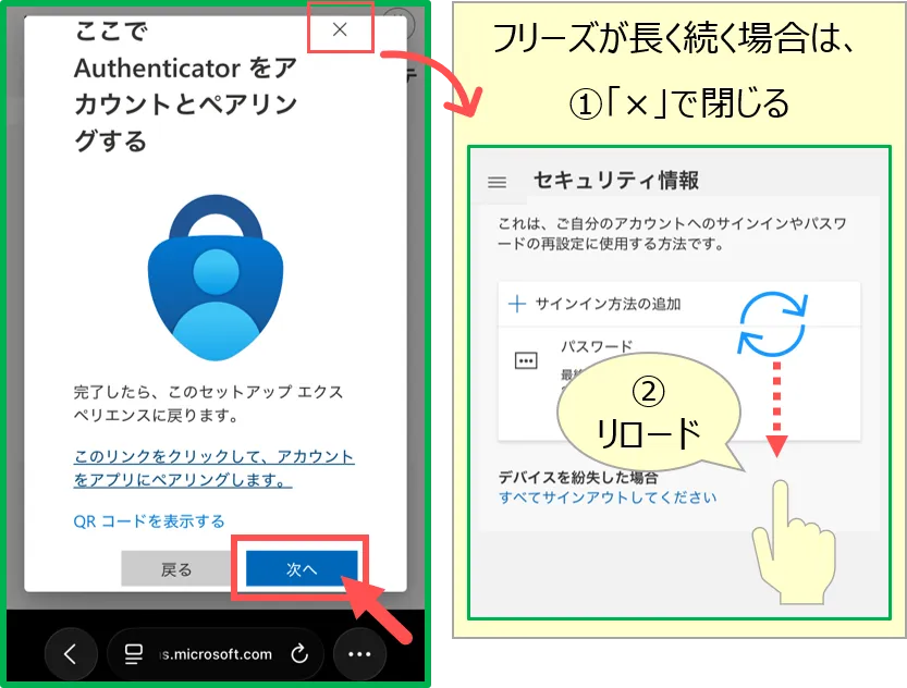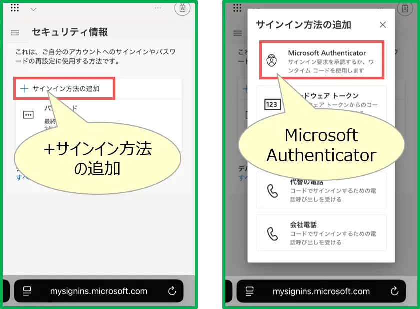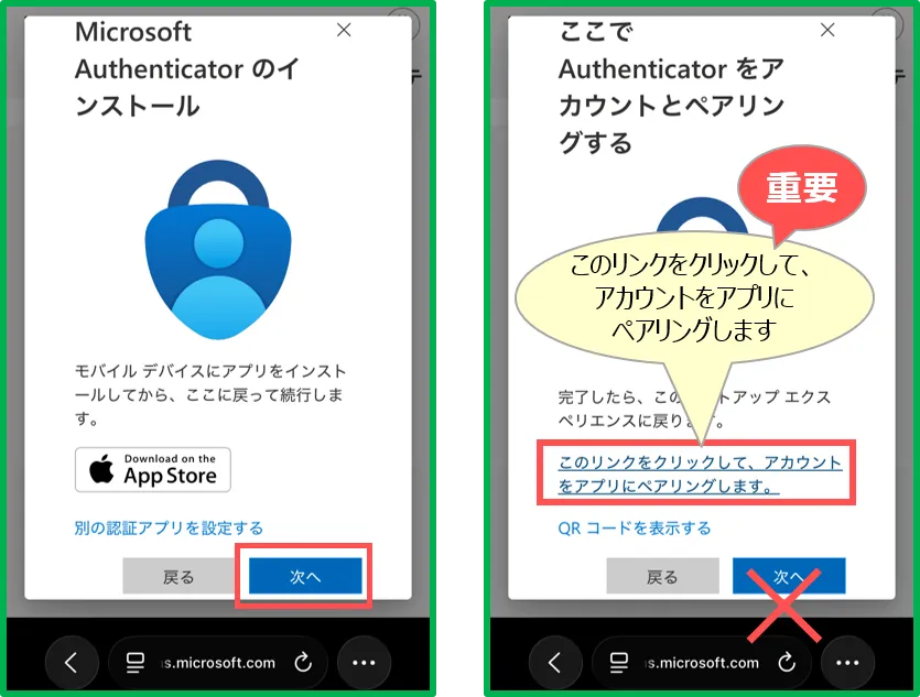 • 1台のスマホで、【ブラウザ】(緑枠で表示)と【Authenticator】(青枠で表示)を切り替えながら作業するため、手順が複雑になりますので、注意してください。