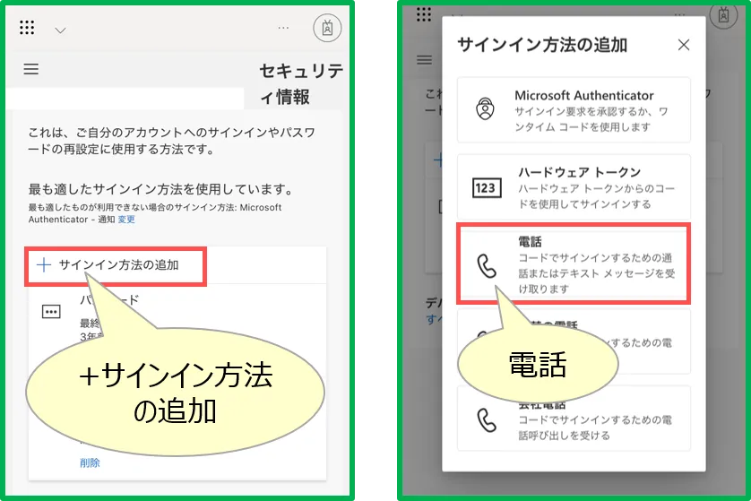 • 「サインイン方法の追加」