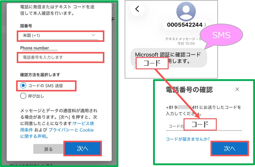 SMSに送信された「コード」を入力します